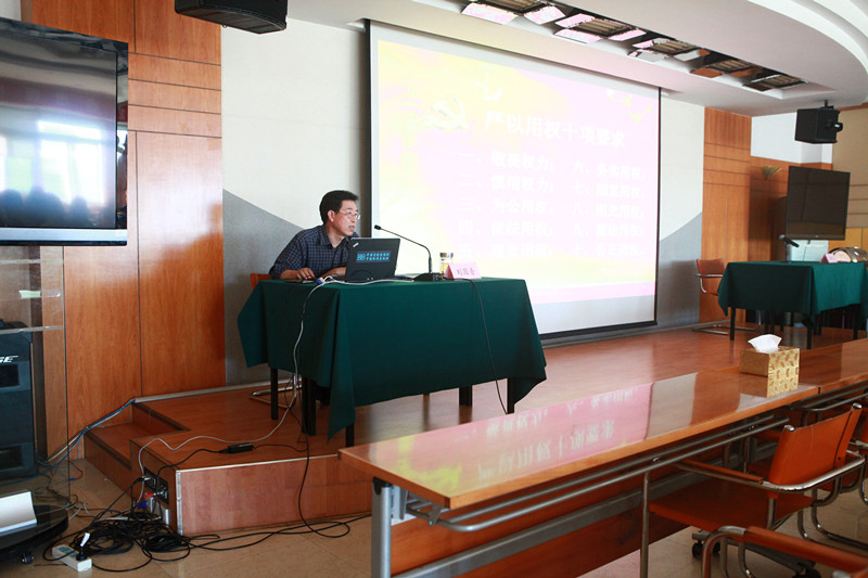 在專題黨課的第一部分,劉國(guó)普首先結(jié)合自己在“三嚴(yán)三實(shí)”專題教育活動(dòng)中的學(xué)習(xí)體會(huì),根據(jù)自己對(duì)“三嚴(yán)三實(shí)”中“嚴(yán)以用權(quán)”的理解,從權(quán)力的定義、嚴(yán)以用權(quán)的重要性和怎樣做到嚴(yán)以用權(quán)3個(gè)方面對(duì)“嚴(yán)以用權(quán)”這一主題進(jìn)行了解讀。他指出,嚴(yán)以用權(quán)直指領(lǐng)導(dǎo)干部作風(fēng)的核心問(wèn)題,領(lǐng)導(dǎo)干部能否正確對(duì)待權(quán)力,按照規(guī)范使用權(quán)力,是每個(gè)干部的第一道門檻和第一堂必修課。解決濫用權(quán)力和不作為這兩個(gè)問(wèn)題的根本方法就是要按規(guī)則、按制度行使權(quán)力,把權(quán)力關(guān)進(jìn)制度的籠子里,任何時(shí)候都不搞特權(quán)、不以權(quán)謀私,真正做到嚴(yán)字當(dāng)頭。