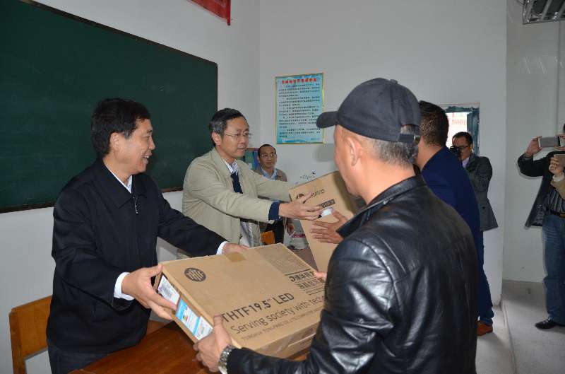 圖為中國(guó)質(zhì)檢出版社社長(zhǎng)李迎豐和江西質(zhì)監(jiān)局副局長(zhǎng)蔡瑋向流坑村農(nóng)家書(shū)屋捐贈(zèng)電腦