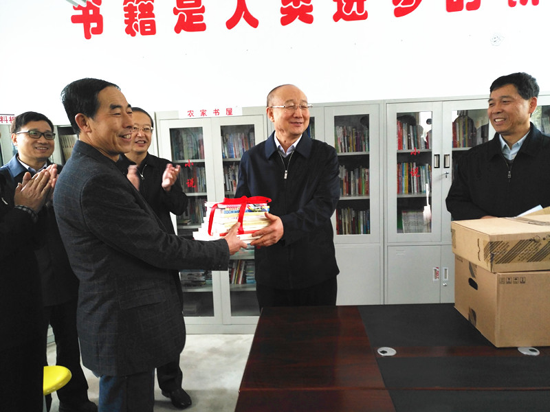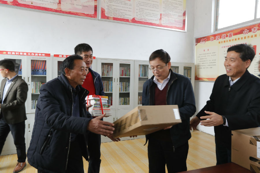 圖為侯建國(右二)向程莊鎮(zhèn)杜南村黨員活動室和農(nóng)家書屋捐贈圖書和電腦 11月16日至17日,質(zhì)檢總局黨組書記侯建國到河南省民權(quán)縣,就定點扶貧工作召開現(xiàn)場辦公