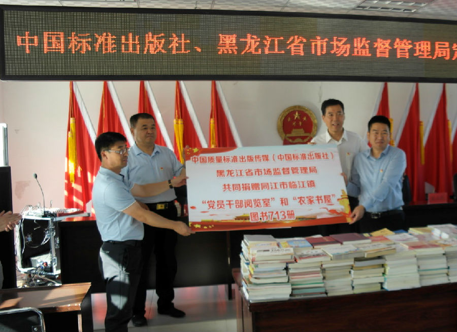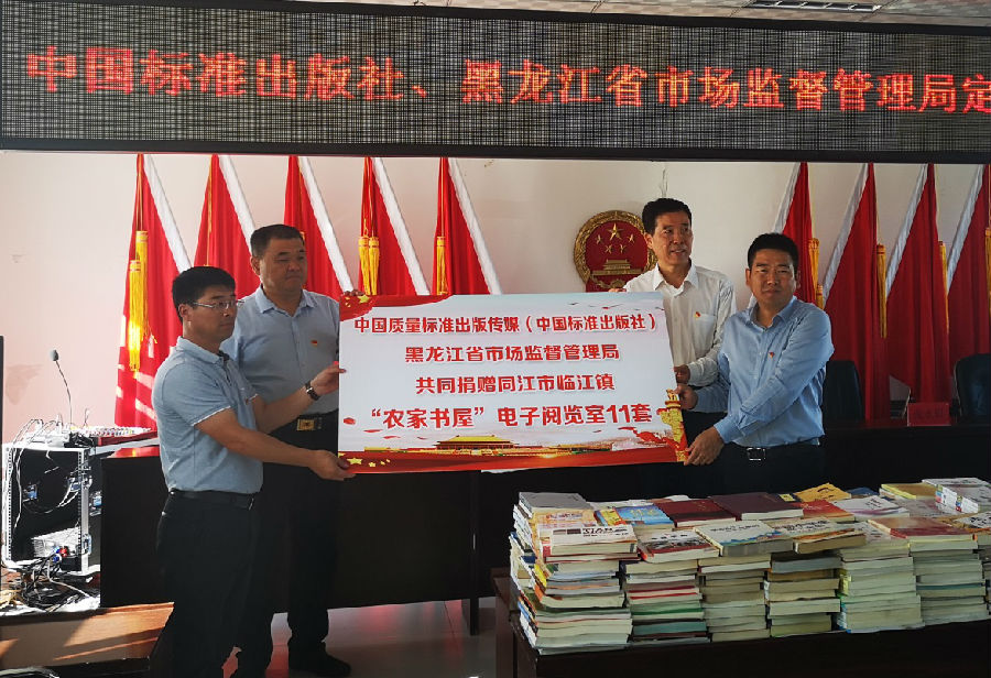 李迎豐和湯占悅分別代表中國標準出版社和黑龍江省市場監(jiān)督管理局向臨江鎮(zhèn)10個農(nóng)家書屋和鎮(zhèn)委、鎮(zhèn)政府黨員干部閱覽室共同捐贈了11套書香閱讀電子閱覽室(三農(nóng)版),并捐贈了713冊圖書。