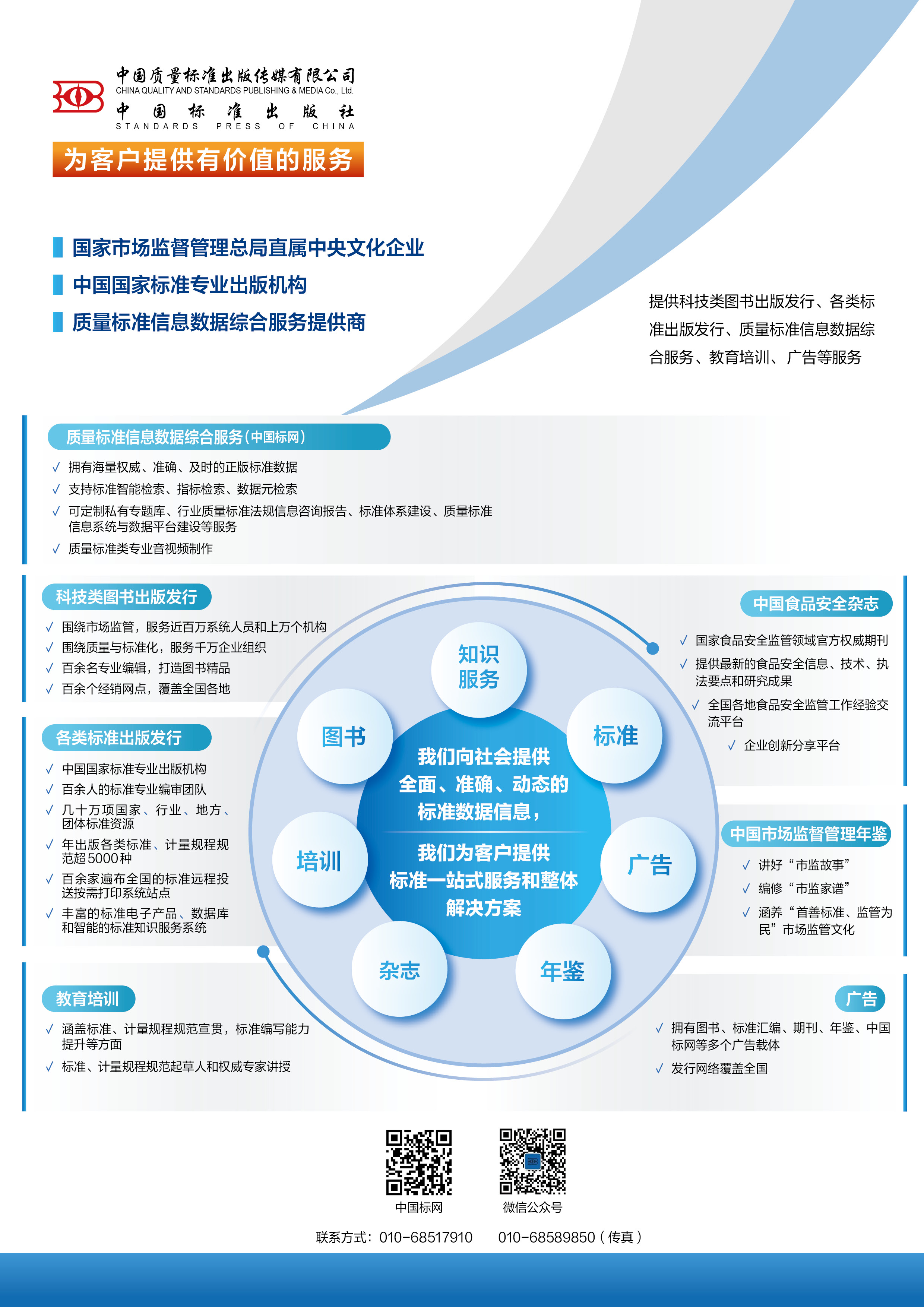 公司內(nèi)設(shè)20個部門,擁有4家下屬企業(yè)。公司具備圖書、期刊、音像制品、電子出版物、網(wǎng)絡(luò)出版資質(zhì),業(yè)務(wù)范圍涵蓋國家標(biāo)準(zhǔn)、行業(yè)標(biāo)準(zhǔn)、地方標(biāo)準(zhǔn)、團體標(biāo)準(zhǔn)、企業(yè)標(biāo)準(zhǔn)以及國家計量技術(shù)規(guī)范出版發(fā)行,市場監(jiān)管領(lǐng)域特別是標(biāo)準(zhǔn)化、計量、檢驗檢測、認(rèn)證認(rèn)可、質(zhì)量管理、食品安全、 特種設(shè)備安全等領(lǐng)域圖書出版發(fā)行,《中國食品安全》等期刊年鑒出版發(fā)行,質(zhì)量標(biāo)準(zhǔn)信息數(shù)據(jù)綜合服務(wù),質(zhì)量標(biāo)準(zhǔn)教育培訓(xùn),標(biāo)準(zhǔn)網(wǎng)絡(luò)服務(wù),質(zhì)量標(biāo)準(zhǔn)文化傳媒服務(wù)等。年出版各類圖書、標(biāo)準(zhǔn)、計量技術(shù)規(guī)范5000余種。
