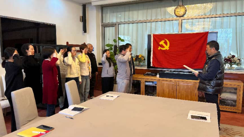 儀式伊始,全體黨員肅立致敬,齊唱《國(guó)際歌》,隨后,支部組織委員嚴(yán)格按照程序,宣讀了公司黨委關(guān)于接收宋奇、王浩宇同志為中國(guó)共產(chǎn)黨預(yù)備黨員的通知。在支部書記的帶領(lǐng)下,宋奇、王浩宇同志與支部全體黨員一同面向鮮紅的黨旗,舉起右拳、目光堅(jiān)定,逐字逐句莊嚴(yán)宣誓。“我志愿加入中國(guó)共產(chǎn)黨,擁護(hù)黨的綱領(lǐng),遵守黨的章程……”誓言鏗鏘有力,既承載著兩位預(yù)備黨員對(duì)黨的無限赤誠(chéng)與堅(jiān)定信念,也傳遞出全體黨員不忘初心、砥礪前行的決心,讓每一位在場(chǎng)者都感受到強(qiáng)烈的心靈震撼與思想升華。